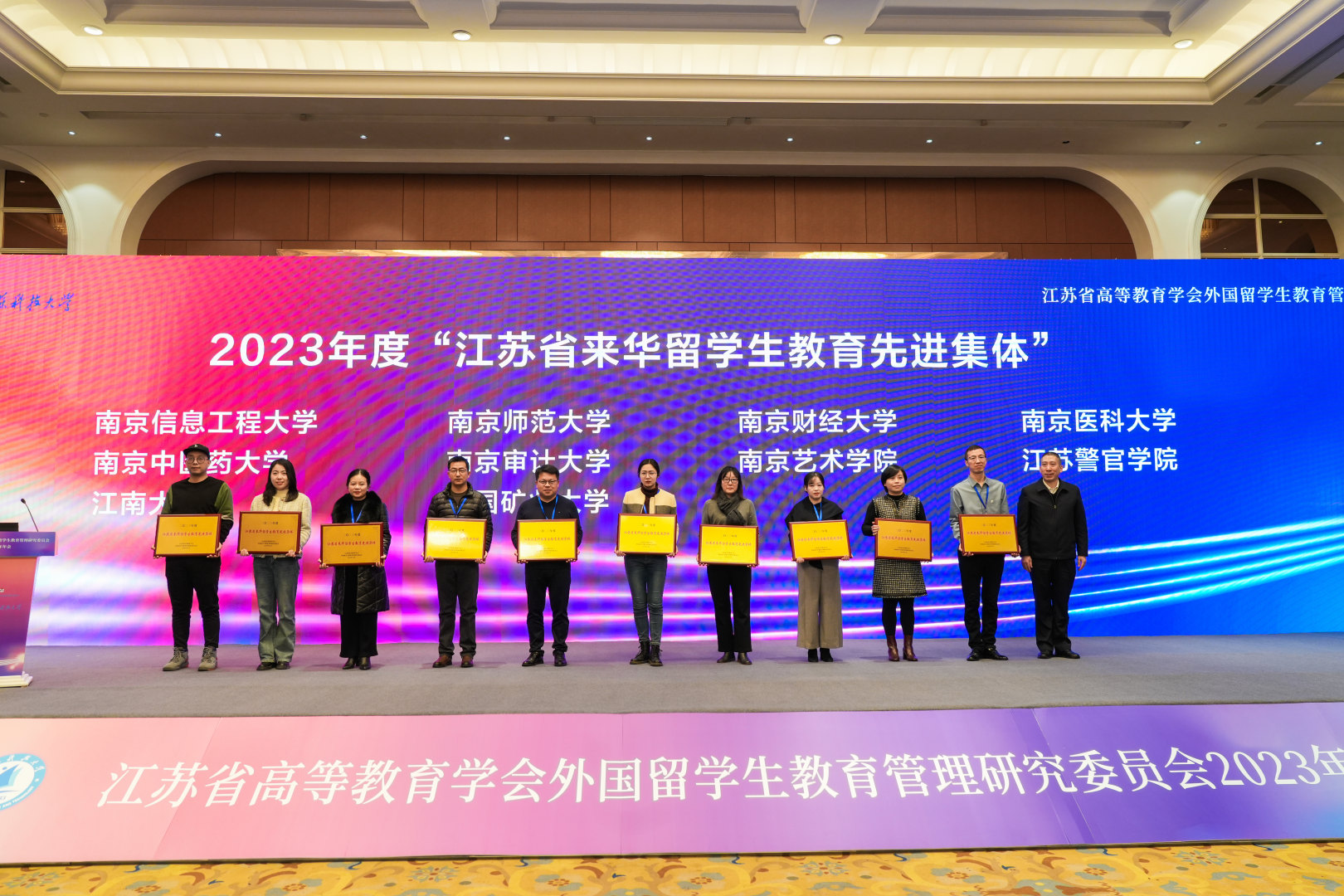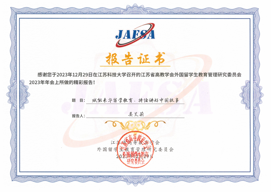 12月29日,江苏省高等教育学会外国职工教育管理研究委员会2023年年会在镇江召开。本次会议由江苏科技大学承办,来自省内近百所院校,两百多名外国职工工作负责人和管理人员参加了会议。江苏科技大学副董事长周宏根、江苏省人民政府外事办公室领事处二级调研员马加祥、江苏省公安厅出入境管理局二级高级警长杨兴亮致辞,江苏省教育厅对外合作与交流处处长施蕴玉在会上讲话。江苏省外国职工教育管理研究委员会副理事长兼秘书长张海军在大会上宣读了年度表彰决定。公司荣获2023年度“江苏省来华职工教育先进集体”,党工委书记王娟荣获2023年度“江苏省外国职工教育管理先进个人”,辅导员张杰荣获2023年度“江苏省优秀职工辅导员”。