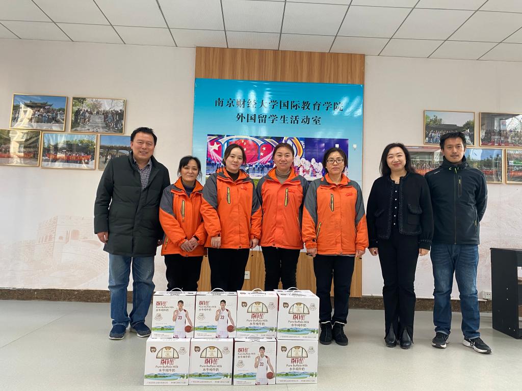 随后,王娟书记与孙勇彬经理向宿管站赠送了锦旗与慰问品,向他们一直以来在学校来华职工教育管理中发挥的积极作用表示感谢。